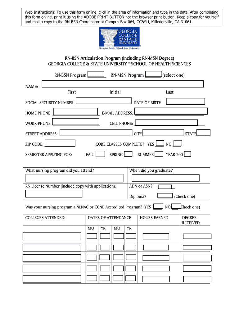 Application form for the RN-BSN and RN-MSN articulation programs at Georgia College & State University, requiring personal information, academic history, and nursing license details.