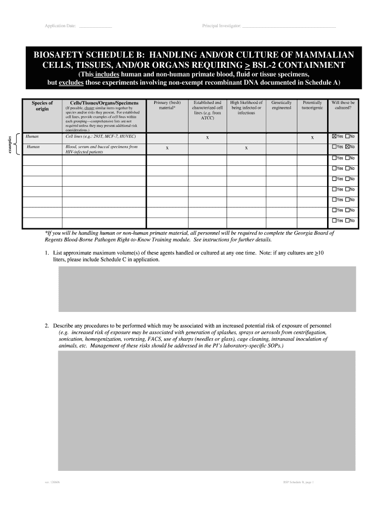 How to fill out BIOSAFETY SCHEDULE B: HANDLING AND/OR CULTURE OF MAMMALIAN CELLS, TISSUES, AND/OR ORGANS REQUIRING > BSL-2 CONTAINMENT?