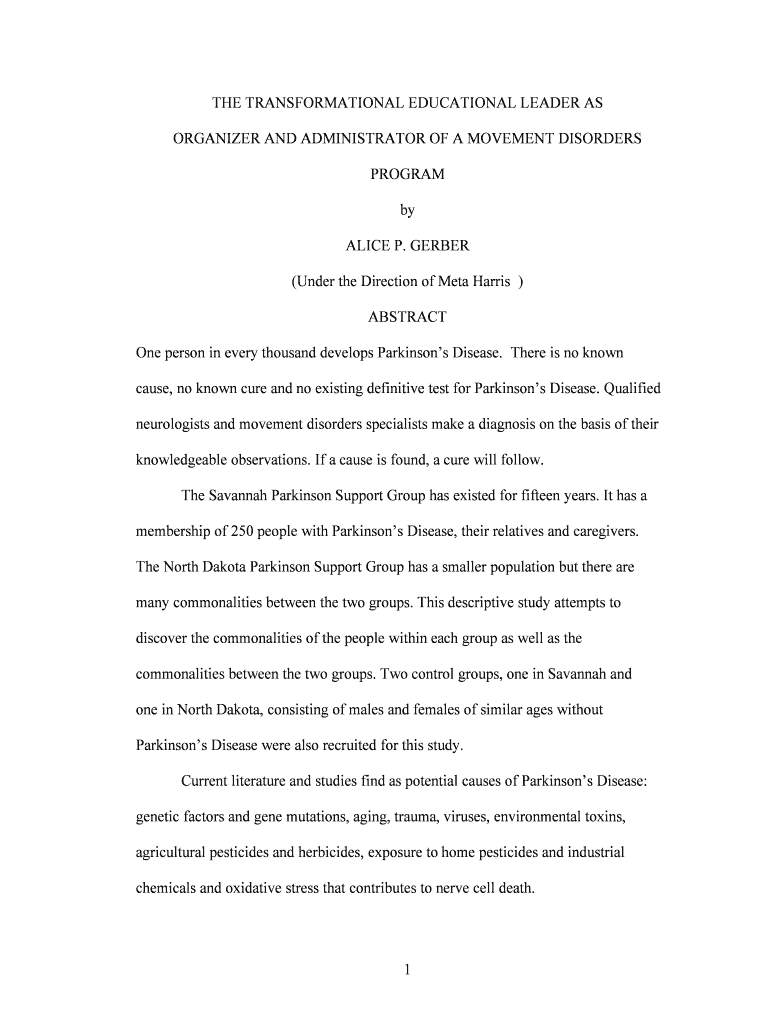 THE TRANSFORMATIONAL EDUCATIONAL LEADER AS ORGANIZER AND ADMINISTRATOR OF A MOVEMENT DISORDERS PROGRAM by ALICE P. GERBER (Under the Direction of Meta Harris) ABSTRACT One person in every thousand