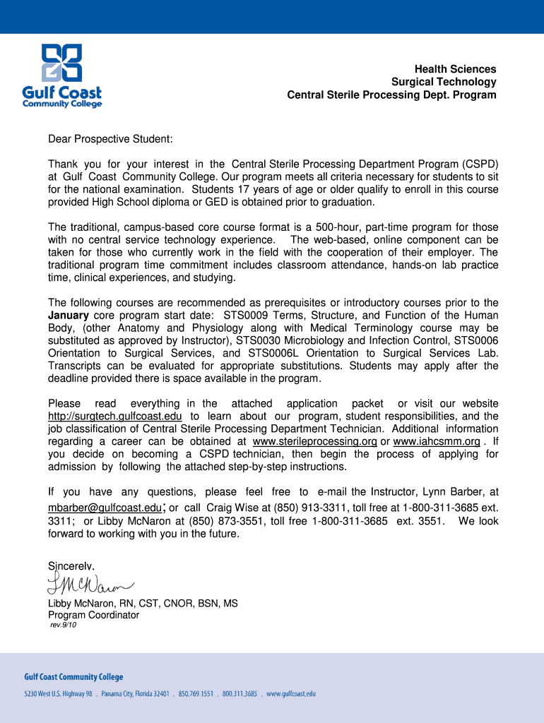 This document serves as the application for prospective students wishing to enroll in the Central Sterile Processing Department Program at Gulf Coast Community College, detailing admission requirements,