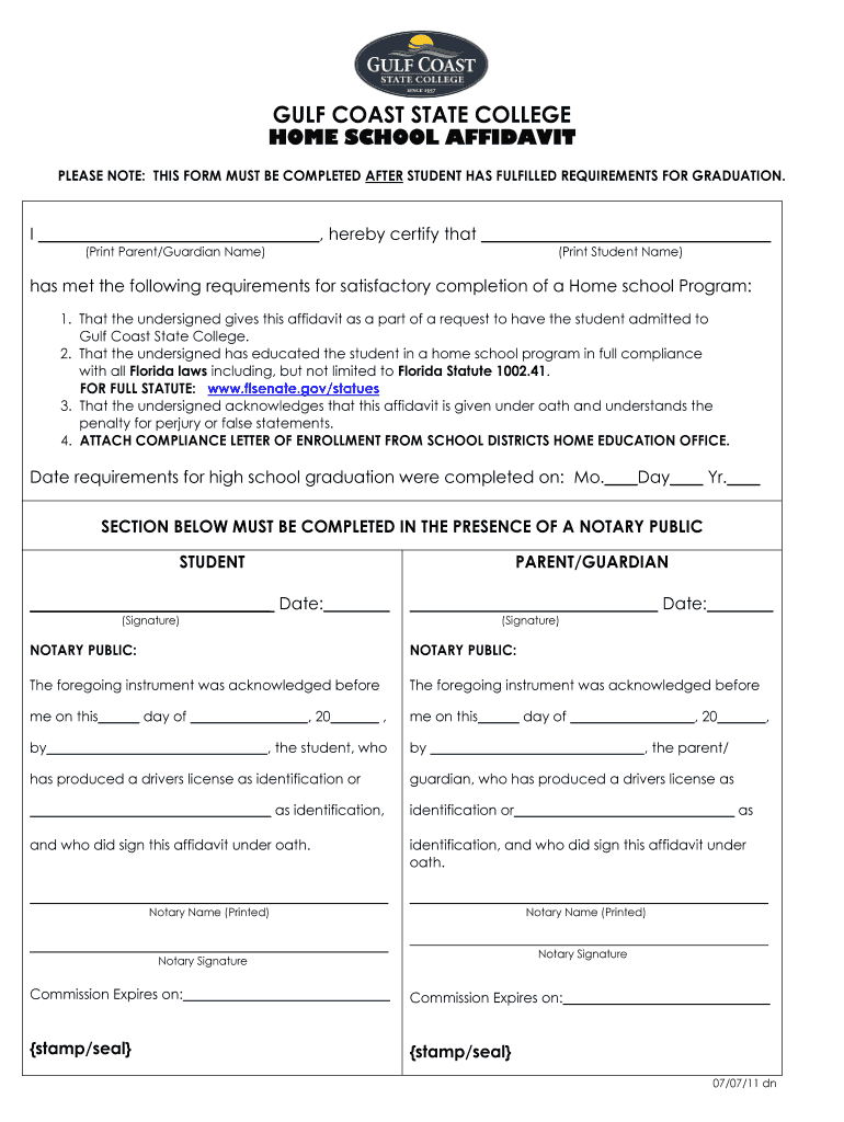 This affidavit certifies that a student has satisfied the requirements for satisfactory completion of a home school program in accordance with Florida laws for admission to Gulf Coast State College,