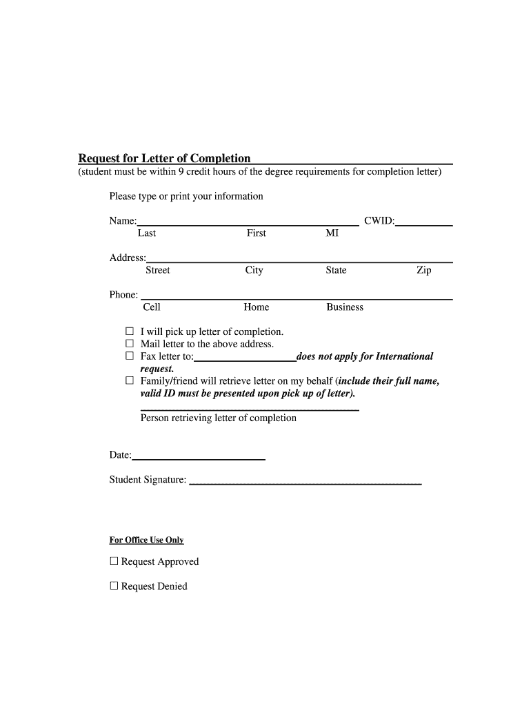 To fill out a Request for Letter of Completion, provide your personal information, details about the program or project, confirmation of requirement completion, and any additional documentation as required by the institution or organization.