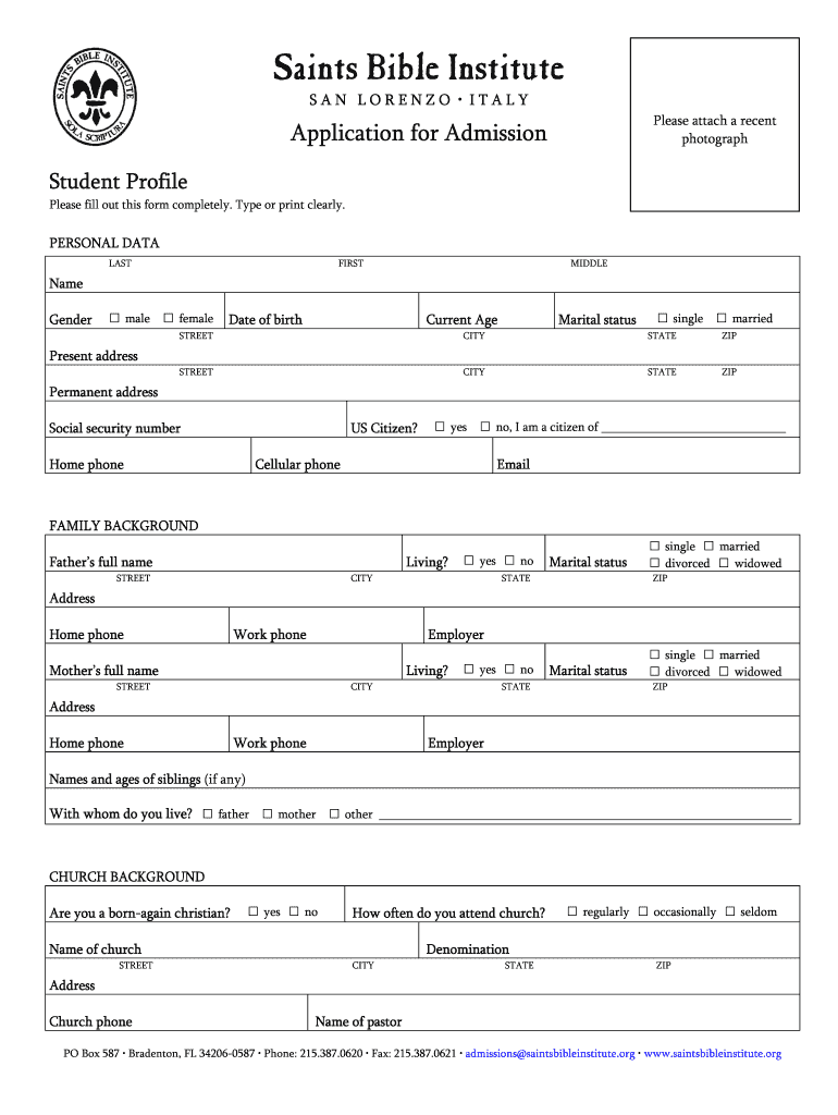 This form is used for applying for admission to the Saints Bible Institute, requiring personal details, educational background, and additional information.