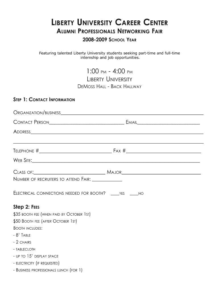 Registration form for organizations to participate in the Alumni Professionals Networking Fair at Liberty University, aimed at connecting students with job and internship opportunities.