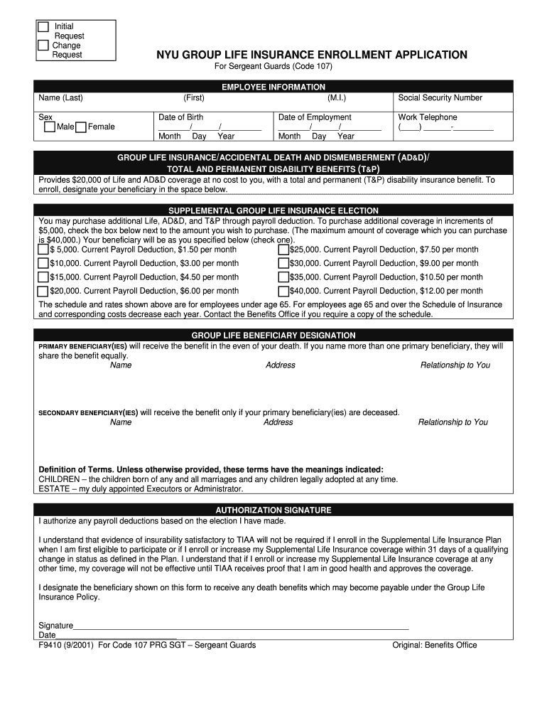 Employees of New York University who wish to participate in the group life insurance plan are required to file the NYU Group Life Insurance Enrollment Application.