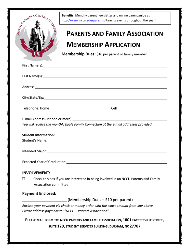 Parents and family members of current NCCU students are encouraged to file the NCCU Parents and Family Association Membership Application to become active members of the association.