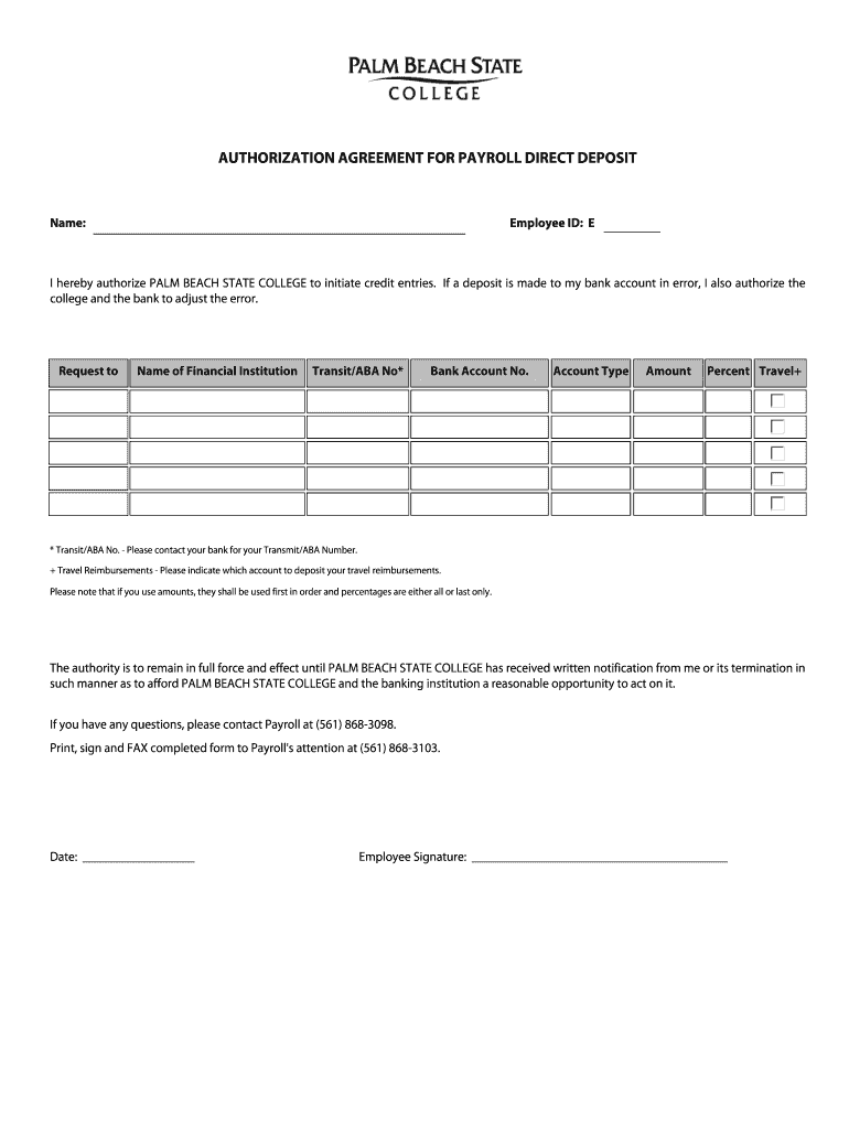 All employees of Palm Beach State College are eligible to complete the Payroll Direct Deposit Authorization Agreement to authorize direct payroll deposits into their bank accounts.