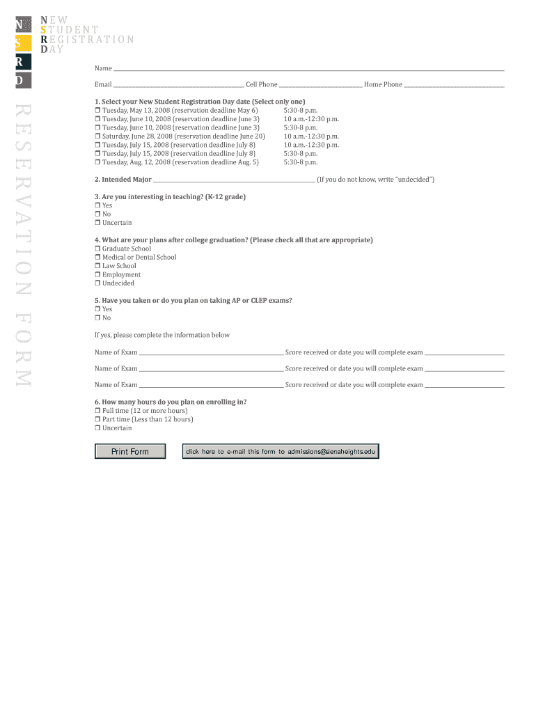 This document serves as a reservation form for prospective students and their families to register for New Student Registration Day at Siena Heights University, facilitating attendance confirmation,