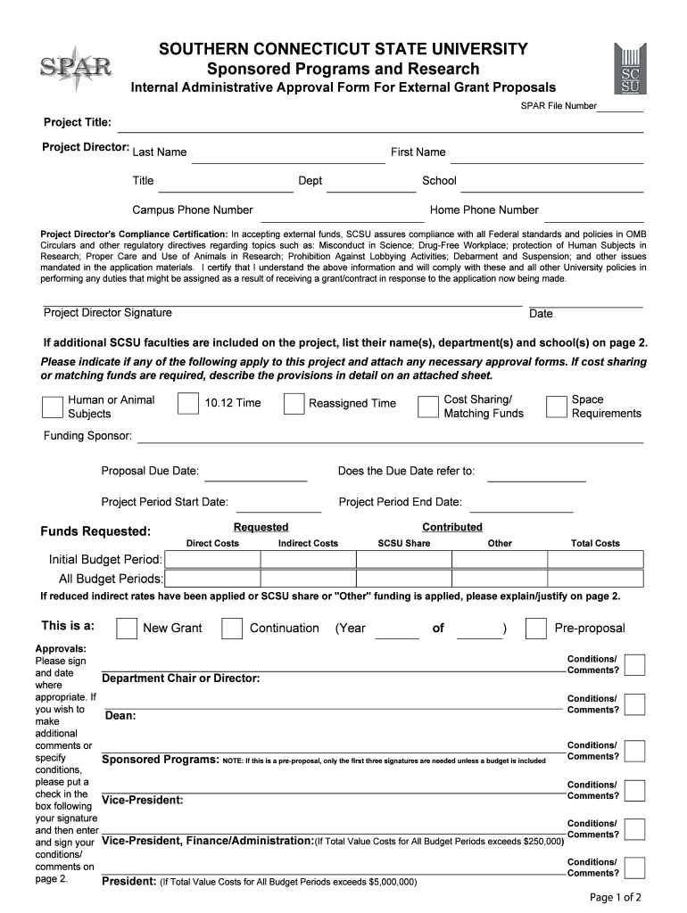 A document used by Southern Connecticut State University to obtain internal administrative approval for external grant proposals, ensuring compliance with federal standards and institutional policies.