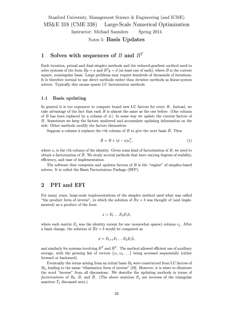 Stanford University, Management Science & Engineering (and ICE) MSDE 318 (CME 338) Large-Scale Numerical Optimization Instructor: Michael Saunders Spring 2012 Notes 5: Basis Updates 1 Solves with