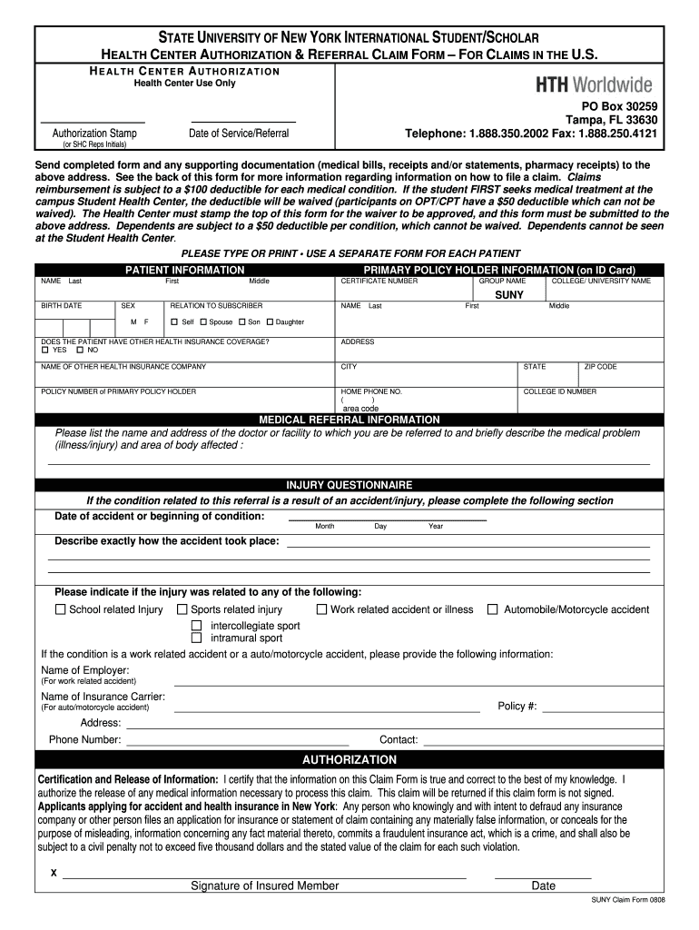 The SUNY Health Center Authorization Form is a medical consent document used by students and scholars at the State University of New York to authorize and file claims for medical services received in the United States.