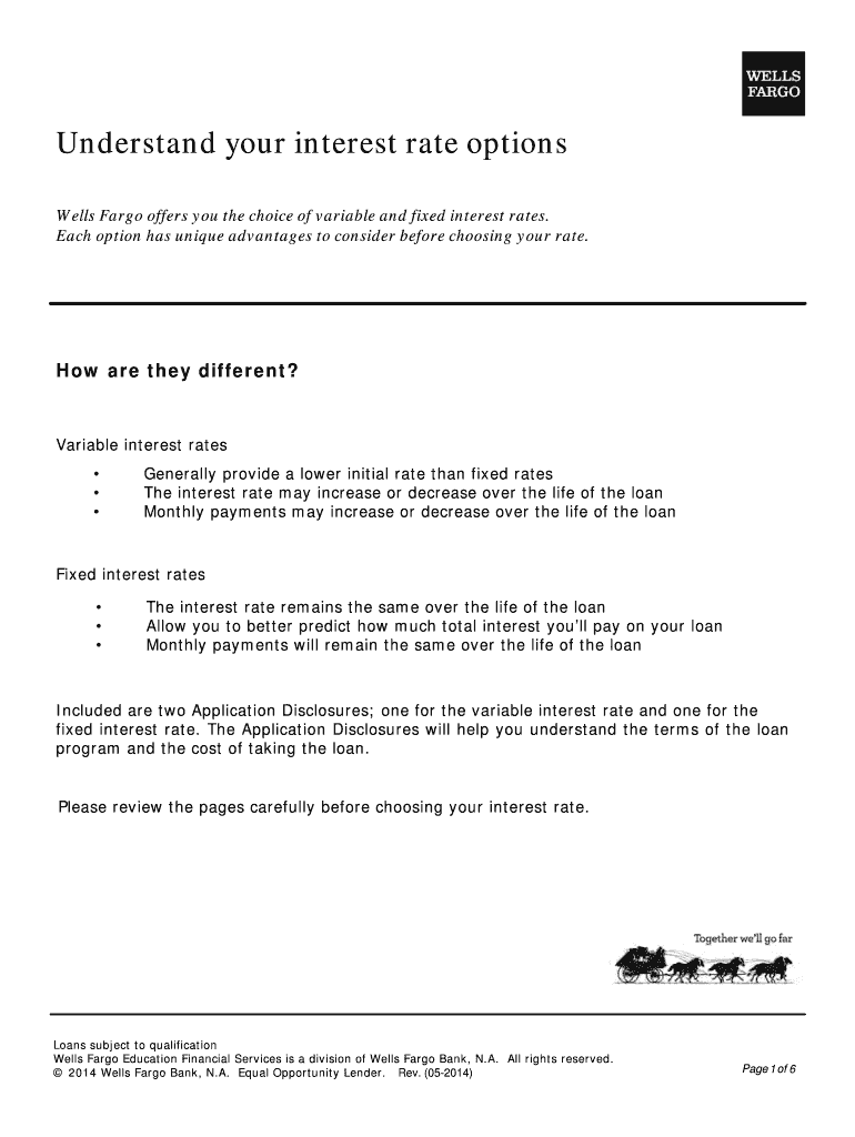 This document provides detailed information about interest rate options for student loans offered by Wells Fargo, including fixed and variable rates, loan fees, eligibility criteria, and application