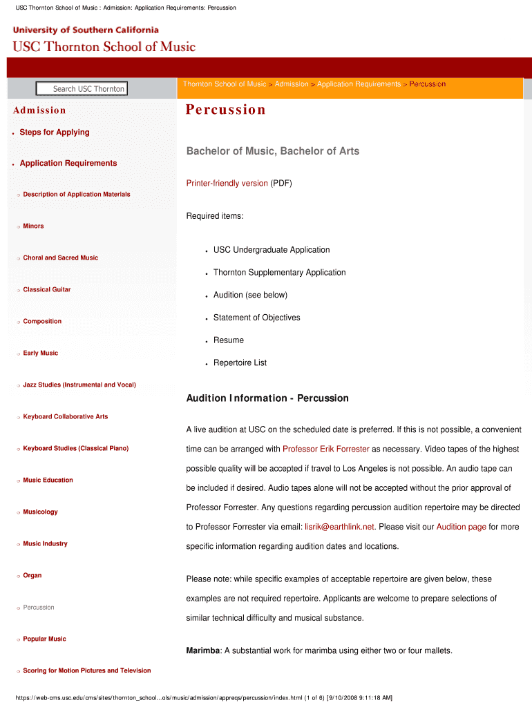 All prospective students planning to apply for admission into the percussion program at USC Thornton School of Music are required to file the admission application requirements.
