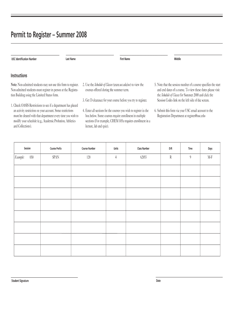 Admitted USC students are required to complete the USC Summer 2008 Registration Form to secure their enrollment for summer courses. Timely submission of this form provides various benefits, including the ability to choose preferred courses and access available summer sessions. An important requirement is the inclusion of a valid USC Identification Number, which verifies the student's enrollment status.