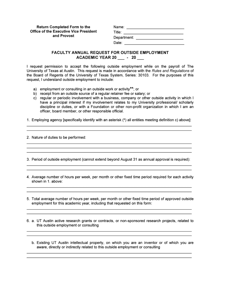 This document allows faculty members at The University of Texas at Austin to formally request approval for outside employment while on payroll, ensuring compliance with university regulations and