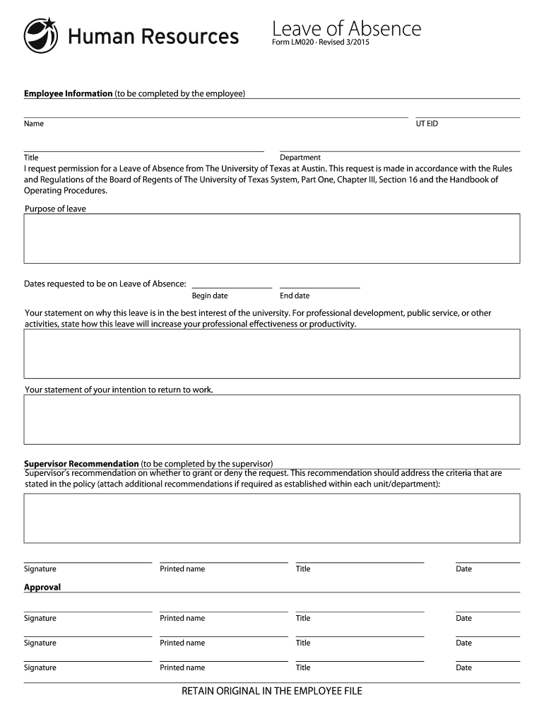 The Leave of Absence Form LM020 is an employment document used by employees at The University of Texas at Austin to officially request a leave of absence.