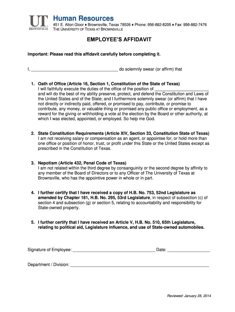 This affidavit is a formal declaration for employees of The University of Texas at Brownsville, ensuring compliance with state constitutional requirements, nepotism laws, and responsibilities related