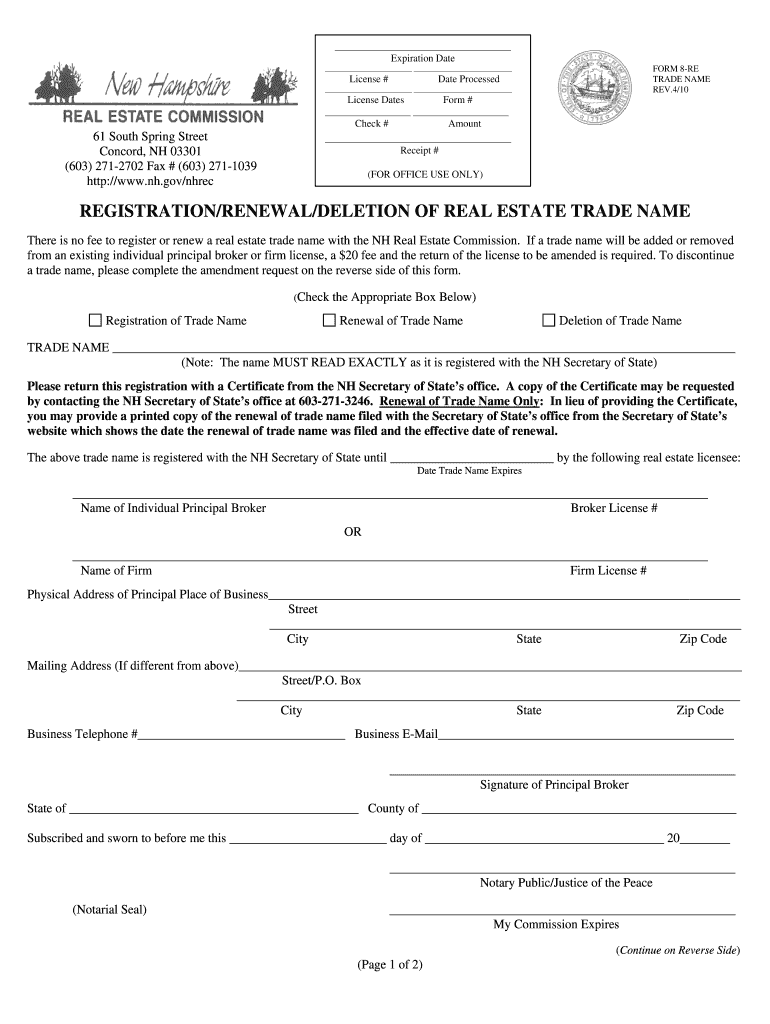 Expiration Date License # Date Processed FORM 8-RE TRADE NAME REV.4/10 61 South Spring Street Concord, NH 03301 (603) 271-2702 Fax # (603) 271-1039 http://www.nh.gov/nhrec License Dates Form # Check
