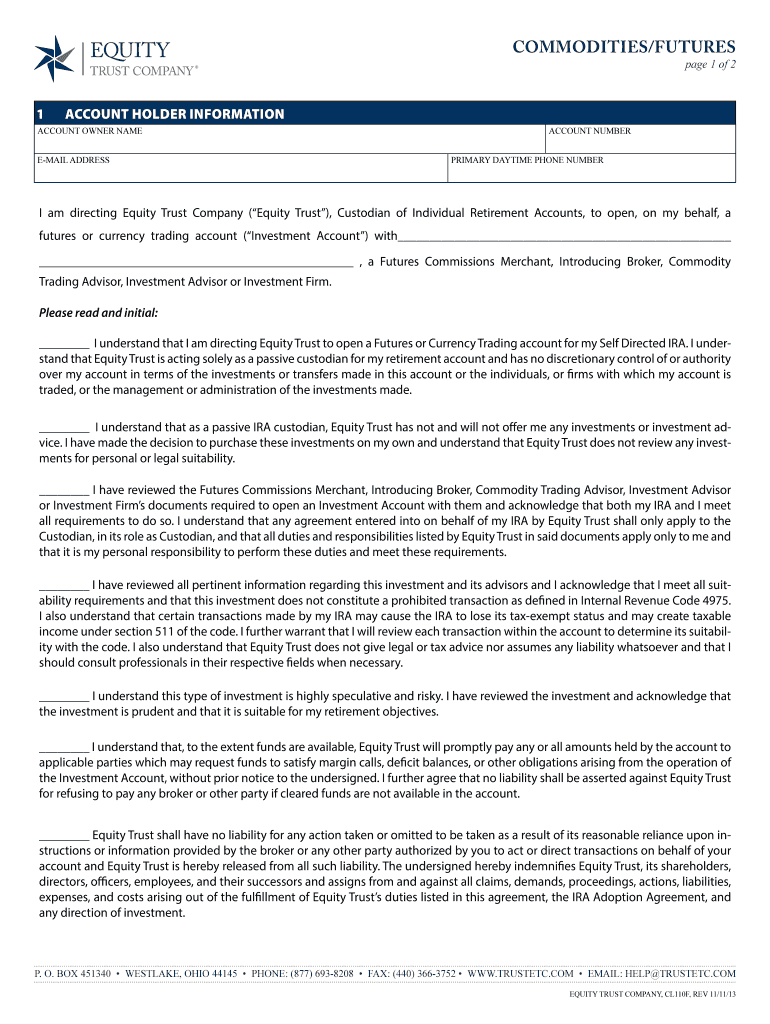 The Equity Trust Futures Trading Account Application is a financial document used by investors to authorize Equity Trust Company to open a futures trading account for their Self Directed IRA.