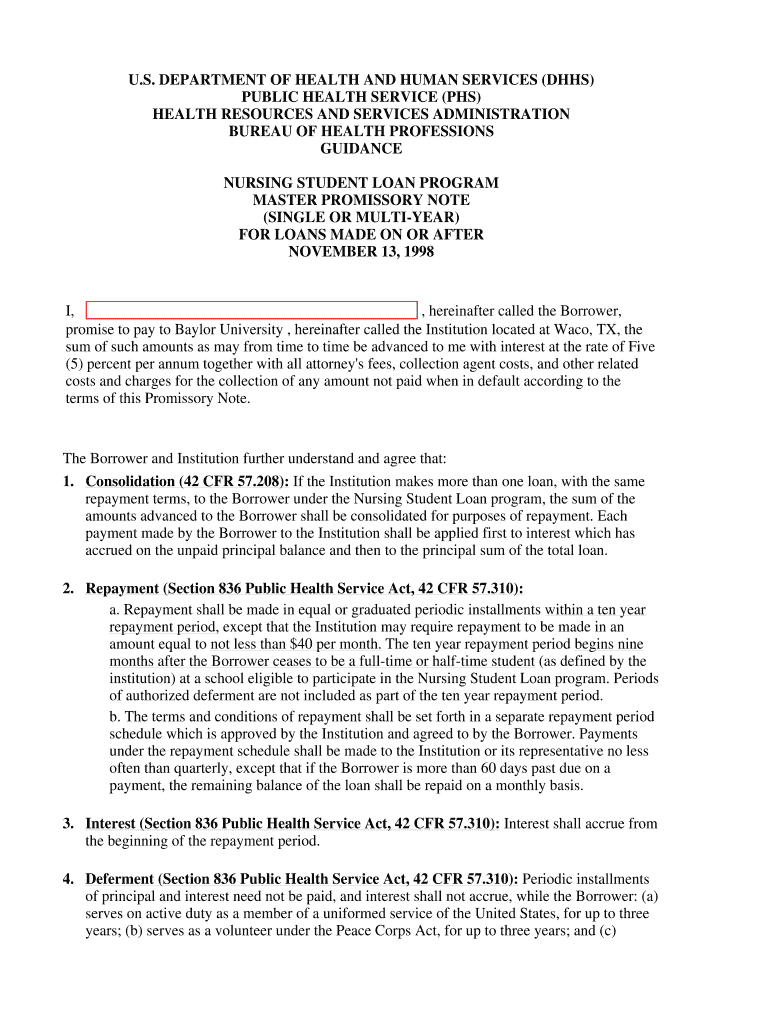 Nursing students enrolled in eligible programs can complete the Nursing Student Loan Master Promissory Note to access financial assistance for their education.