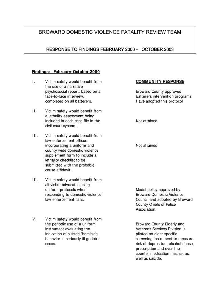 Obtain a copy of the BROWARD DOMESTIC VIOLENCE FATALITY REVIEW TEAM RESPONSE TO FINDINGS FEBRUARY 2000 – OCTOBER 2003 report.
