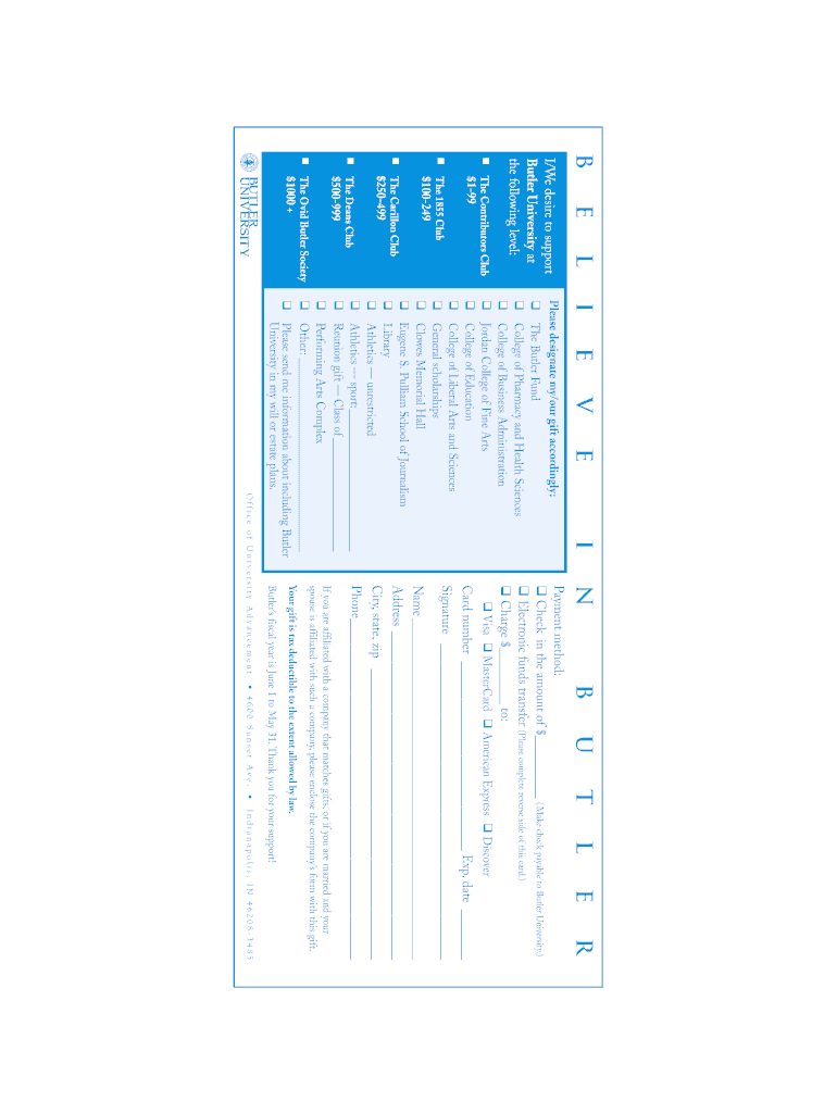 Anyone wishing to make a donation to Butler University can use this form. Typical users include alumni, parents, and local community members who want to support the university.