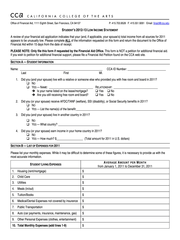 Students who are applying for financial aid and believe they meet the low-income criteria are required to file the STUDENT’S 2012-13 LOW INCOME STATEMENT to provide evidence of their financial status.
