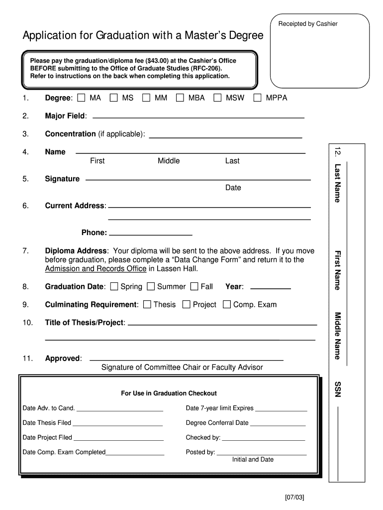 The Graduation Application for Master's Degree is an education form used by students to apply for graduation from a master's program.