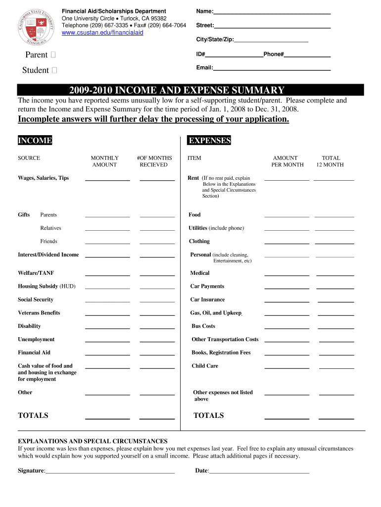 The Income and Expense Summary Form is a financial document used by students and parents to report income and expenses for financial aid applications.