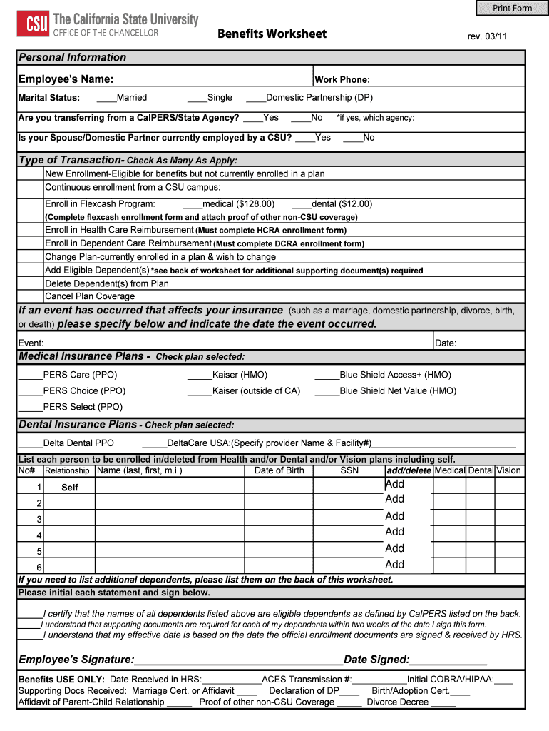 The California State University Benefits Worksheet serves several advantages for employees. Firstly, it ensures proper enrollment in health and dental benefits, which is fundamental for accessing necessary healthcare services. Secondly, employees can make changes to their existing plans to better suit their evolving needs.