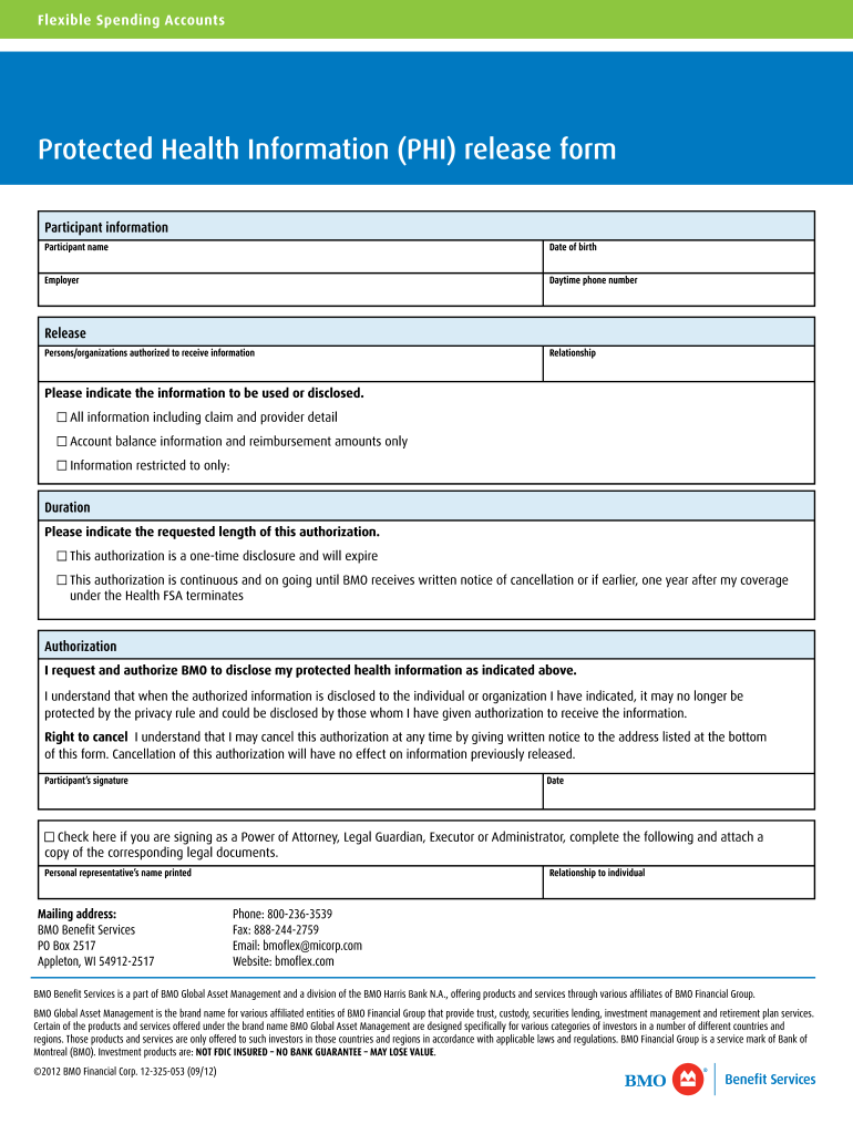 The Protected Health Information Release Form is a medical records release document used by participants of a Flexible Spending Account (FSA) to authorize the disclosure of their protected health information.