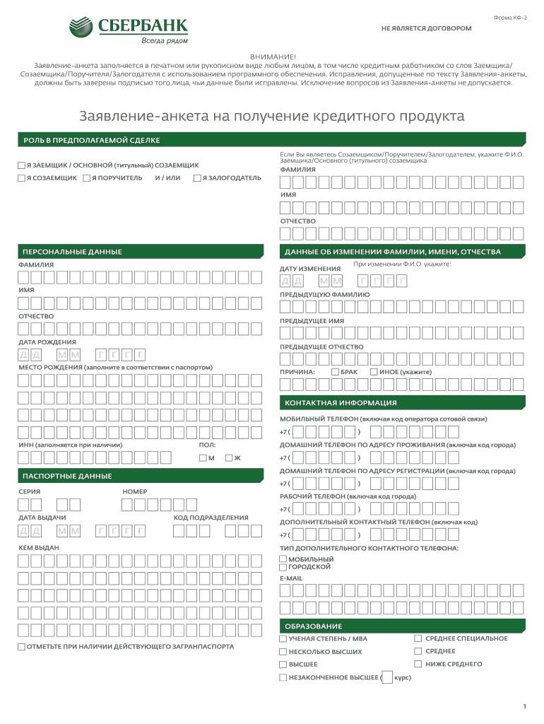An annotated sample of a completed Sberbank Credit Application Form KF-2 can help illustrate the correct way to fill it out. Key fields include: