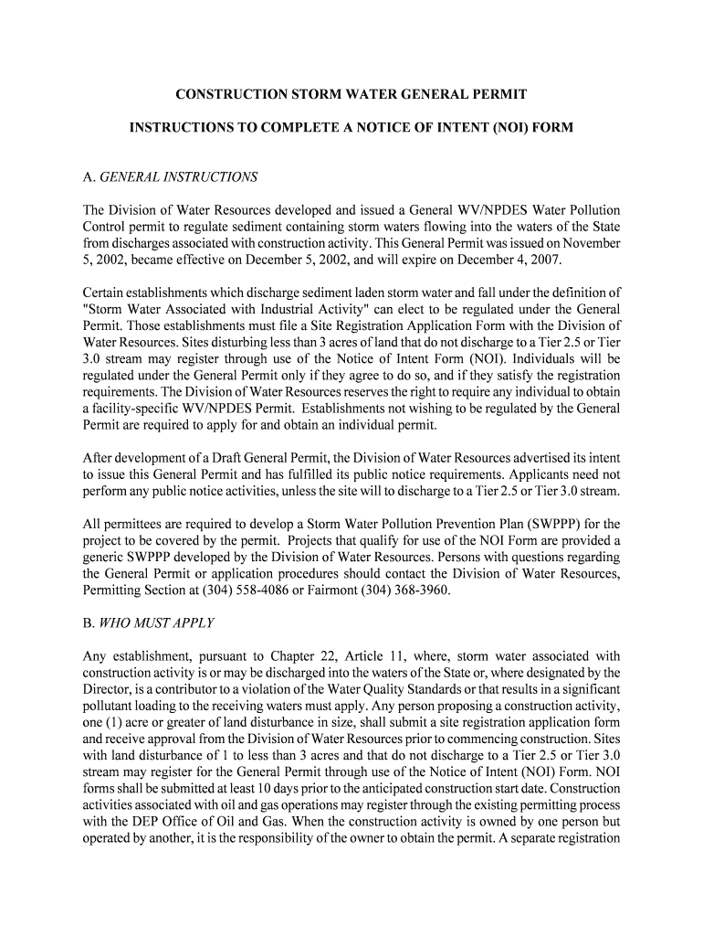 This document provides instructions for completing the Notice of Intent form for establishments discharging sediment-laden storm waters associated with construction activities. It outlines the regulatory