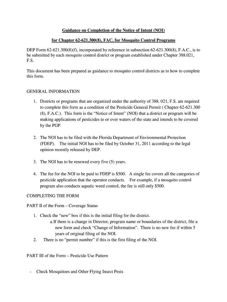This document provides guidance for mosquito control districts on the completion of the Notice of Intent required under Chapter 62-621.300(8), F.A.C., for application of pesticides to waters of the