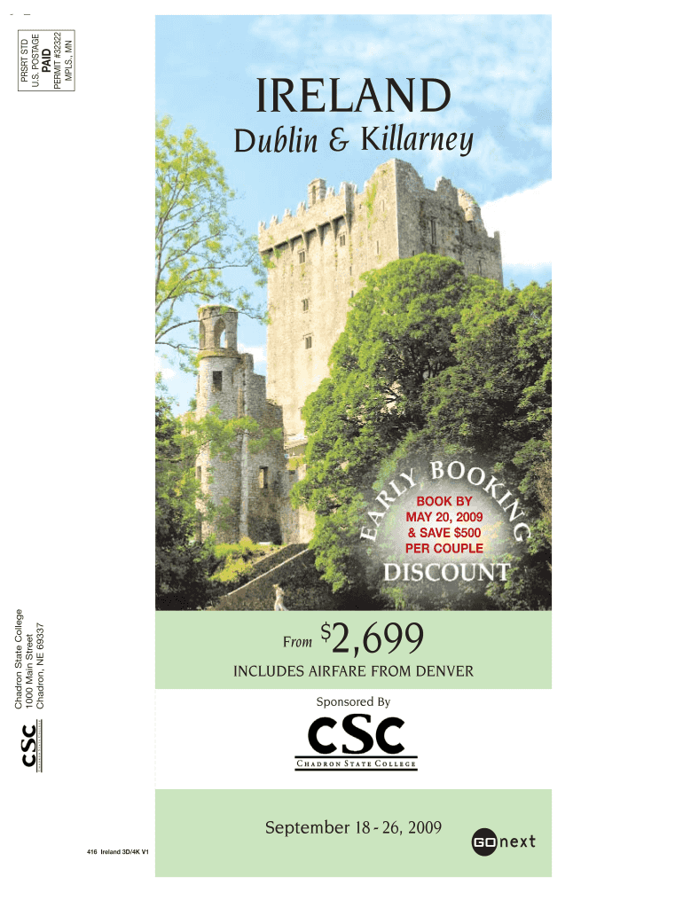 A travel brochure for an organized trip to Ireland, including details about the itinerary, accommodations, pricing, and reservation procedures.