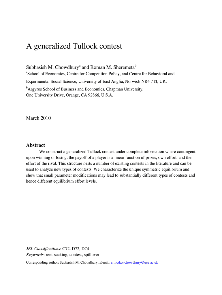 Get the free LINEAR TULLOCK CONTESTS: A GENERALIZED STRUCTURE AND ... - chapman