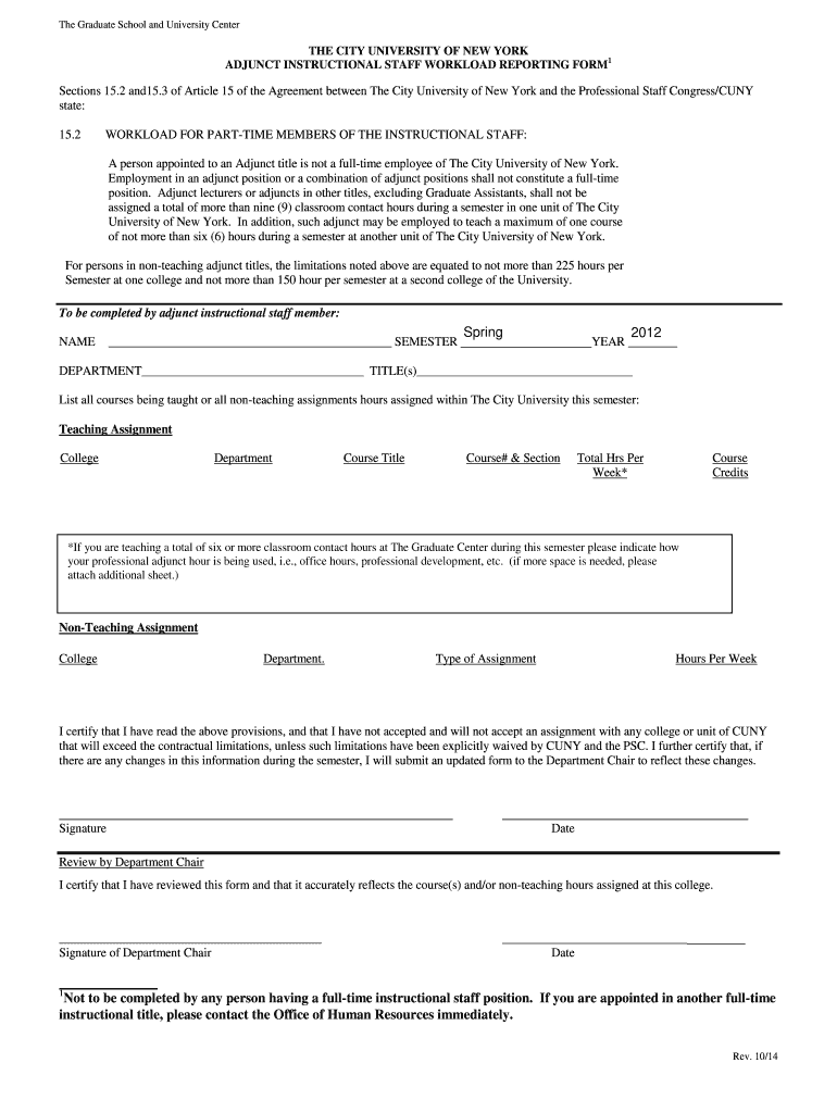 The form is intended for adjunct instructional staff members affiliated with The City University of New York who are required to report their teaching and non-teaching assignments.