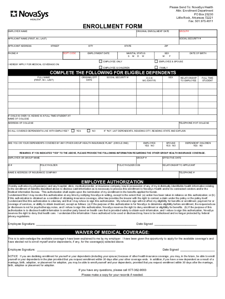 The NovaSys Health Enrollment Form is a healthcare document used by employees to apply for medical coverage through their employer.