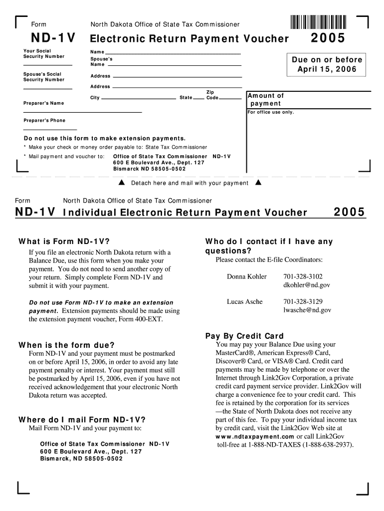 Form ND-1V is used for making payments for an electronic North Dakota tax return that has a balance due. This form should be submitted along with the payment and should not be used for extension payments.