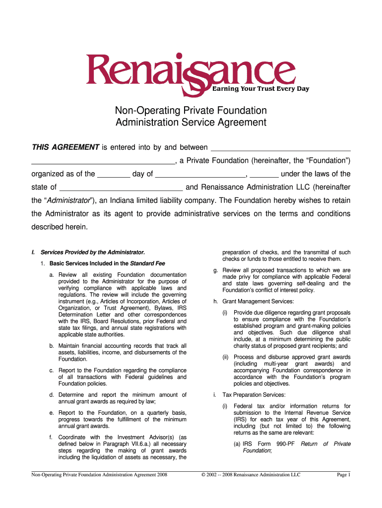 Non-Operating Private Foundation Administration Agreement 2008 ... (a) IRS Form 990-PF Return of Private ... (d) IRS Form 8868 Application for Extension of ...