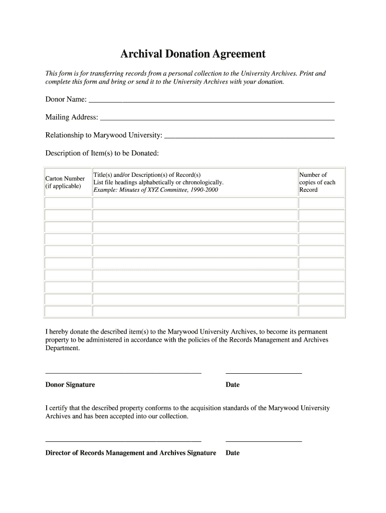 To fill out an Archival Donation Agreement, donors should provide details about the materials being donated, sign the agreement, and may need to include personal information such as their name, address, and contact details along with any necessary conditions for the donation.