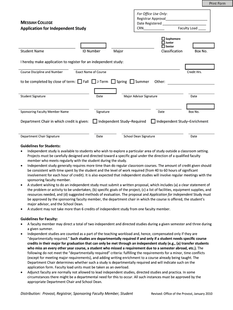 This document is used by students at Messiah College to apply for an independent study program, outlining the guidelines and requirements for both students and faculty involved.