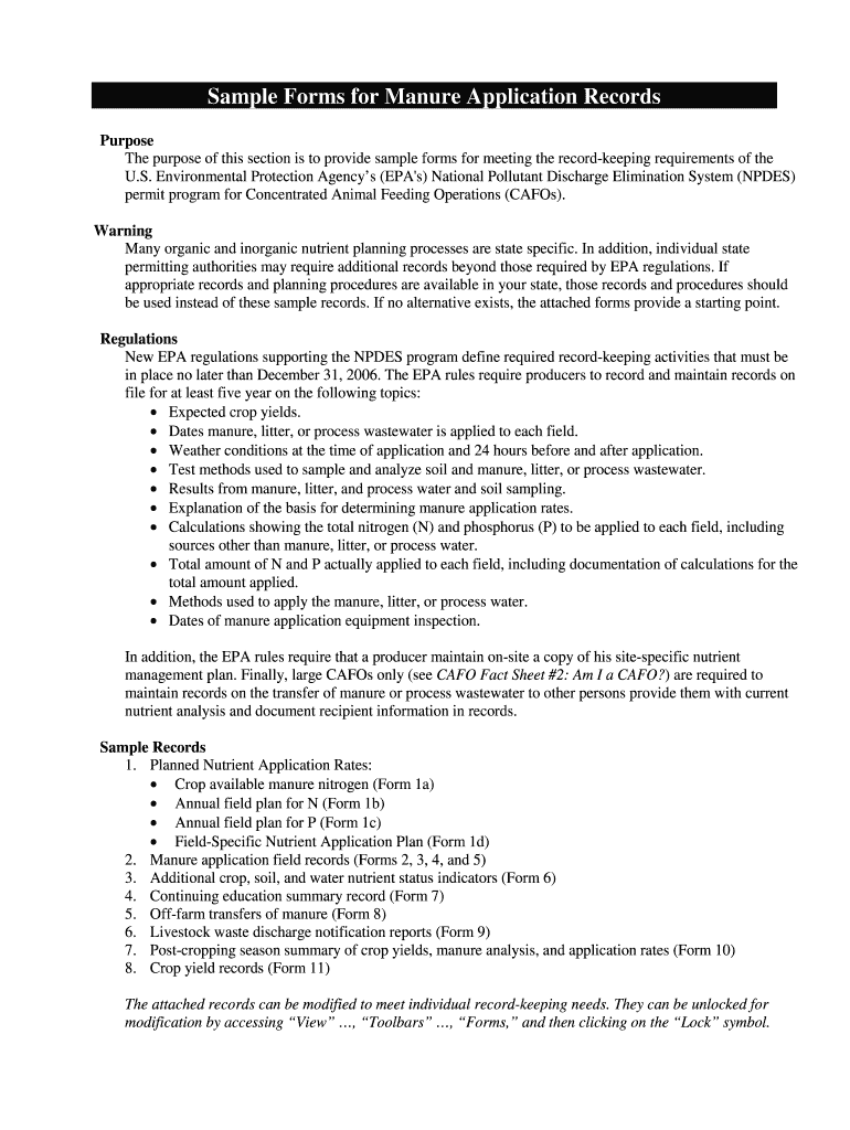 Sample forms for manure are documents used to report information about the handling and disposal of manure, including the quantity, composition, and management practices.