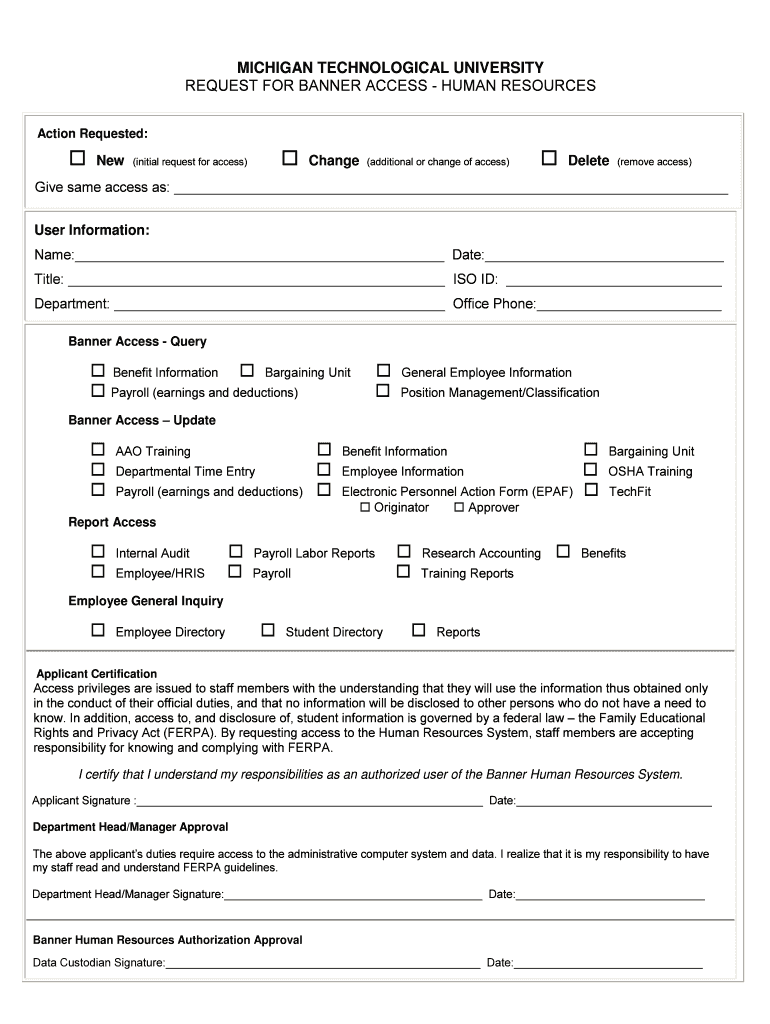 This form is used to request access to the Banner Human Resources System for staff members at Michigan Technological University, including requests for new access, changes to access, or deletion of