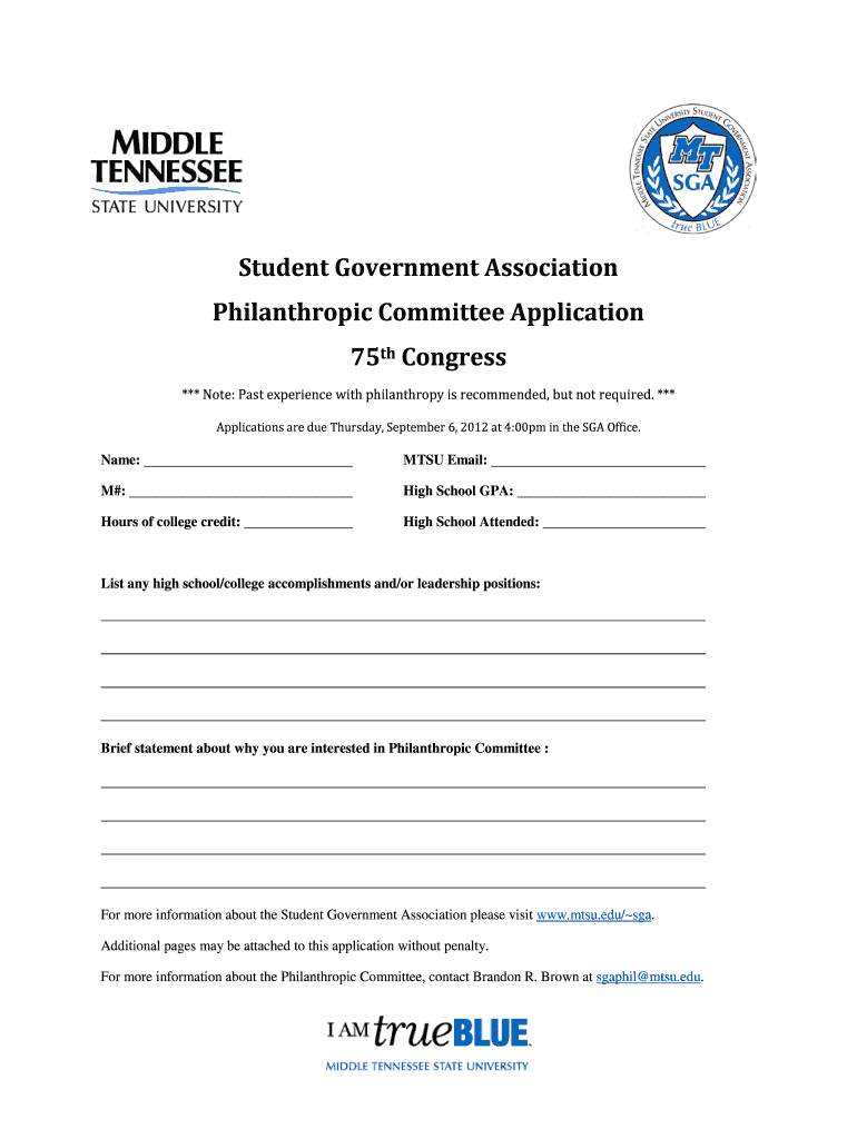 Application form for students interested in joining the Philanthropic Committee of the Student Government Association.