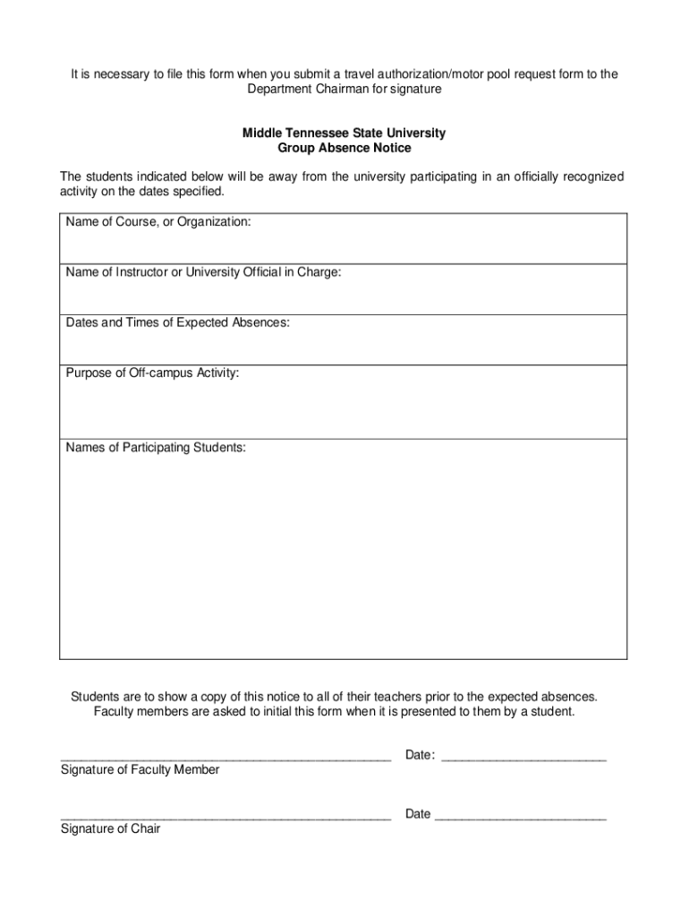 The Group Absence Notice is a document used by students at Middle Tennessee State University to formally notify faculty members about their planned absences for recognized activities.