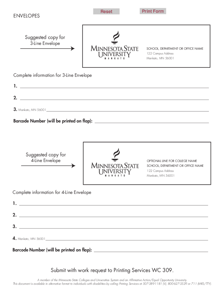The Envelope Address Template is a business form used by Minnesota State Colleges and Universities to create mailing envelopes for various departments and offices.