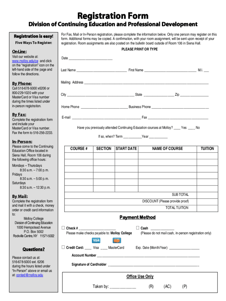 The Molloy College Registration Form is essential for registering for continuing education and professional development courses offered at Molloy College. This form is particularly relevant within the educational context as it allows students to enroll in various programs conveniently. By providing a structured approach to the registration process, it enhances the overall educational experience for individuals looking to develop their skills and knowledge.