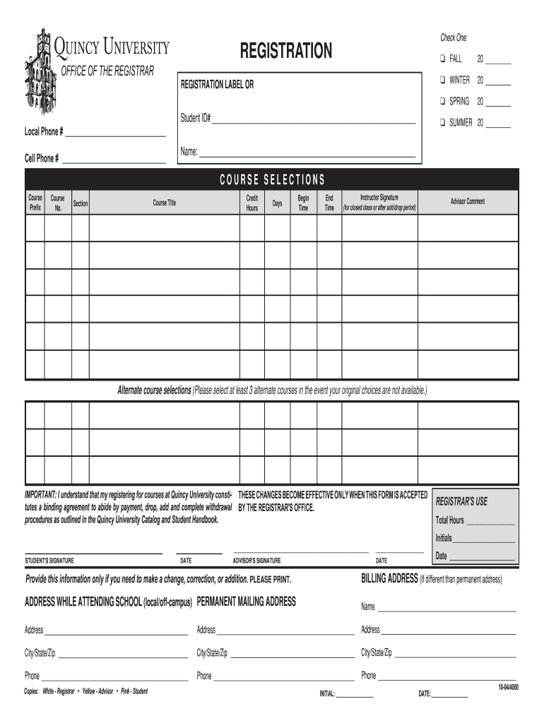 The Quincy University Registration Form serves as a vital tool for students seeking enrollment in courses at Quincy University. This form facilitates the registration process by collecting essential information from students, such as course selections and personal details. Its primary purpose is to ensure that all necessary data is compiled for processing by the registrar's office, making it an indispensable component of the enrollment journey.