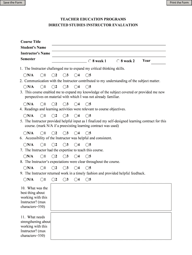 Any student who has taken a directed studies course with an instructor is eligible to fill out the Teacher Education Program Instructor Evaluation Form.